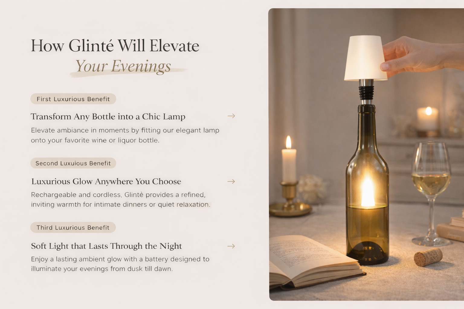 "Glinté has completely transformed the atmosphere in my home. What used to be empty wine bottles are now elegant statement pieces. The warm glow is incredibly refined — soft, inviting, and never harsh. It instantly elevates dinner tables, bedside spaces, and quiet evenings. The craftsmanship feels premium, and the cordless design makes it effortless to style anywhere. I genuinely recommend it to anyone who appreciates thoughtful, ambient lighting."